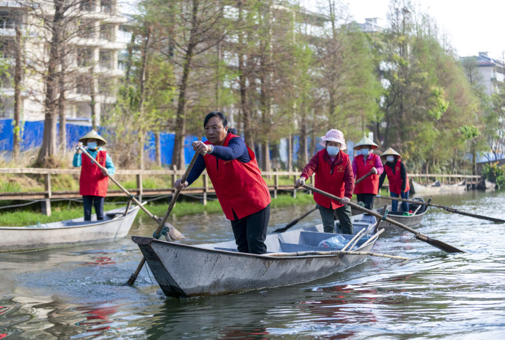 3月20日,李云麗(左二)帶領巾幗打撈隊隊員劃船準備到滇池草海開展打撈工作。新華社記者陳欣波 攝