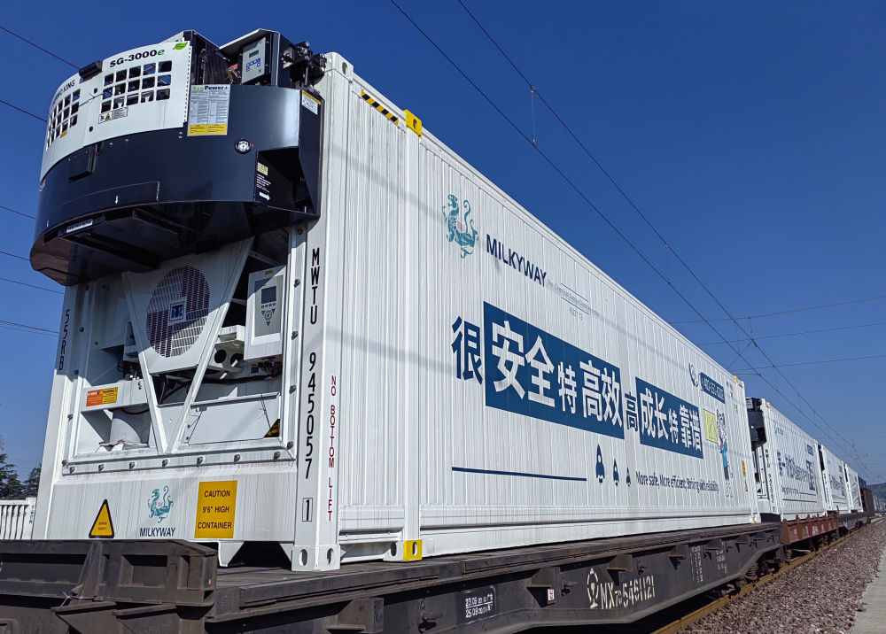 4月19日,裝載著來自泰國等地熱帶水果的冷鏈集裝箱到達昆明東站。新華社發(秦文璐 攝)