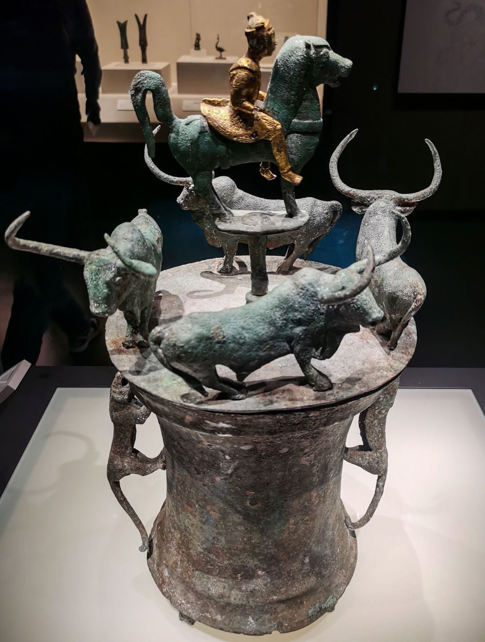 云南省博物館展陳的四牛鎏金騎士銅貯貝器(3月26日攝)。新華社記者陳冬書 攝