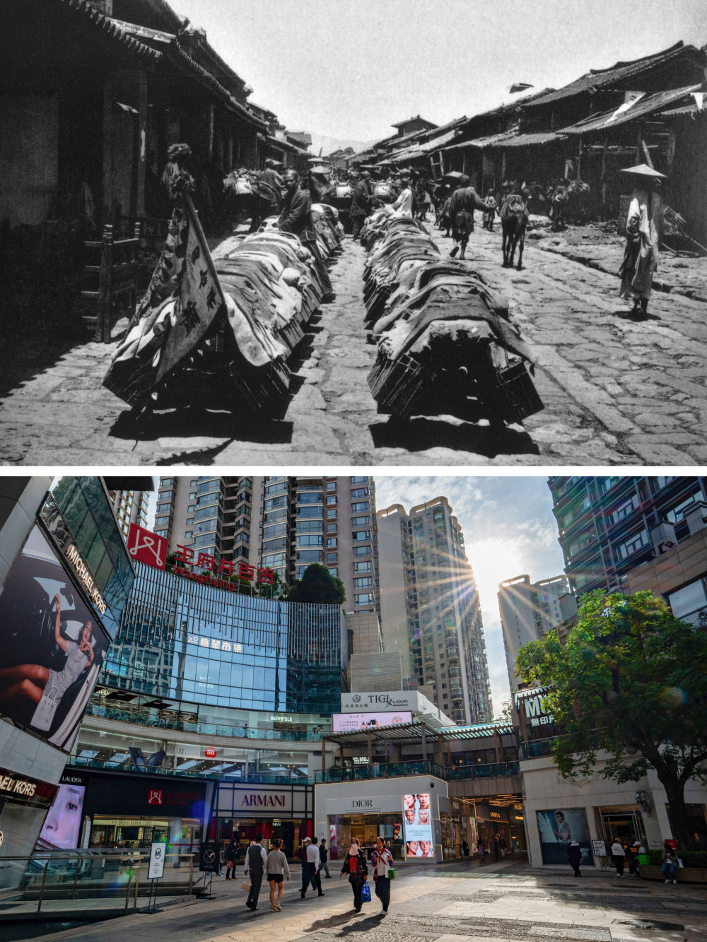 上圖為:清末,法國駐華官員方蘇雅拍攝的鏢局押運馬幫在順城街的照片(資料照片由殷曉俊提供)。下圖為:6月15日拍攝的昆明順城街購物中心景象。新華社記者江文耀?攝