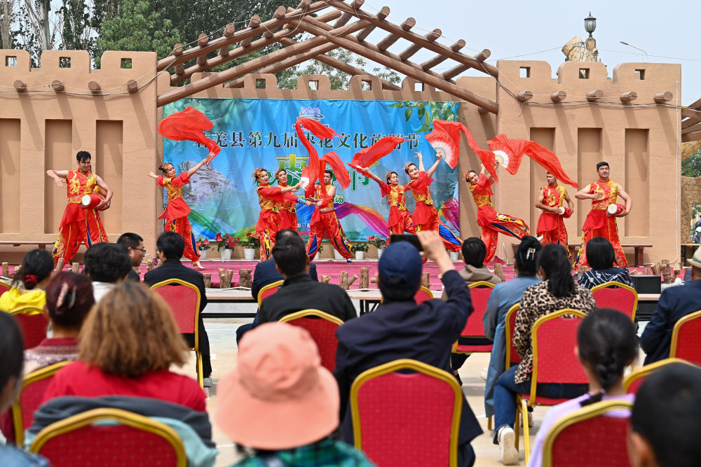 在新疆若羌縣瓦石峽鎮,若羌縣樓蘭藝術團的演員為參加棗花節的游客表演歌舞(5月28日攝)。新華社記者 丁磊 攝