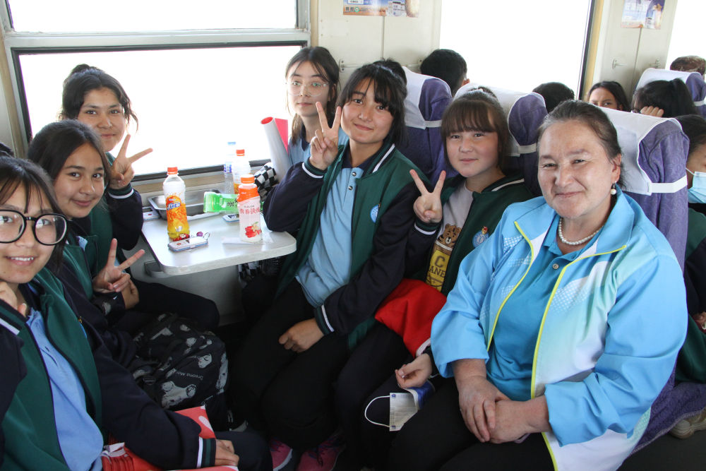這是乘坐和若鐵路列車去庫爾班大叔家鄉研學的學生們和老師(5月29日攝)。新華社記者 劉紅霞 攝