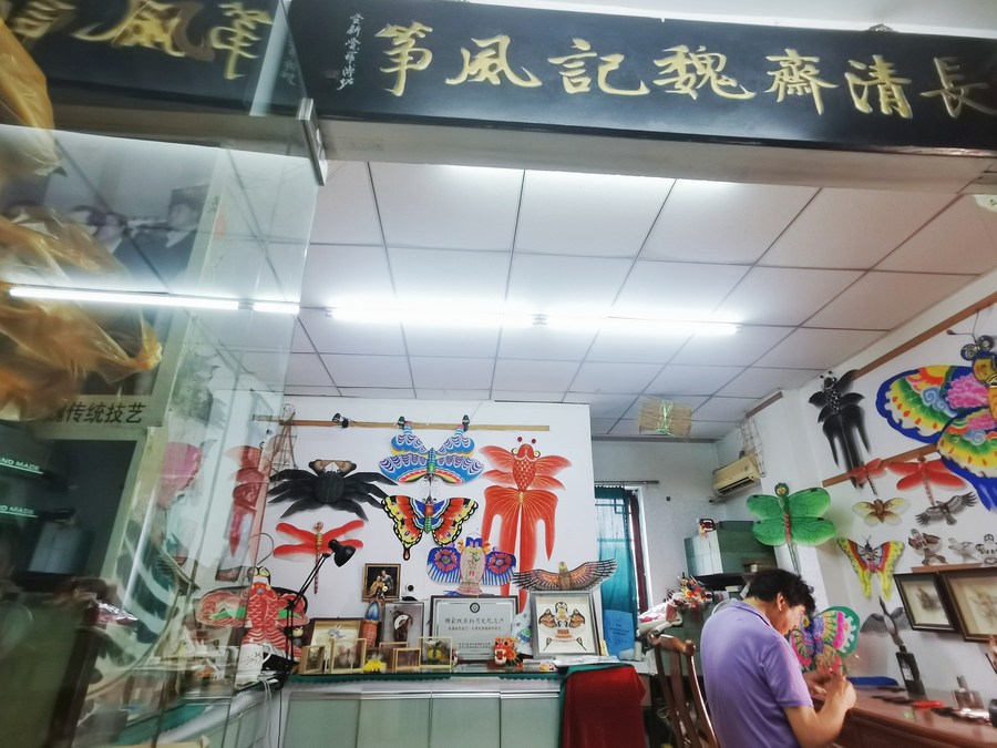 碧瓦紅磚、雕梁畫棟,沿著位于城區正中的鼓樓漫步探尋,掛有“長清齋魏記風箏”牌匾的小屋就隱身于街側一家書畫城內。