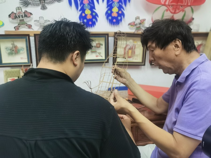 魏國秋(右)、魏博文父子正在探討風箏制作技藝。新華社記者 劉惟真 攝