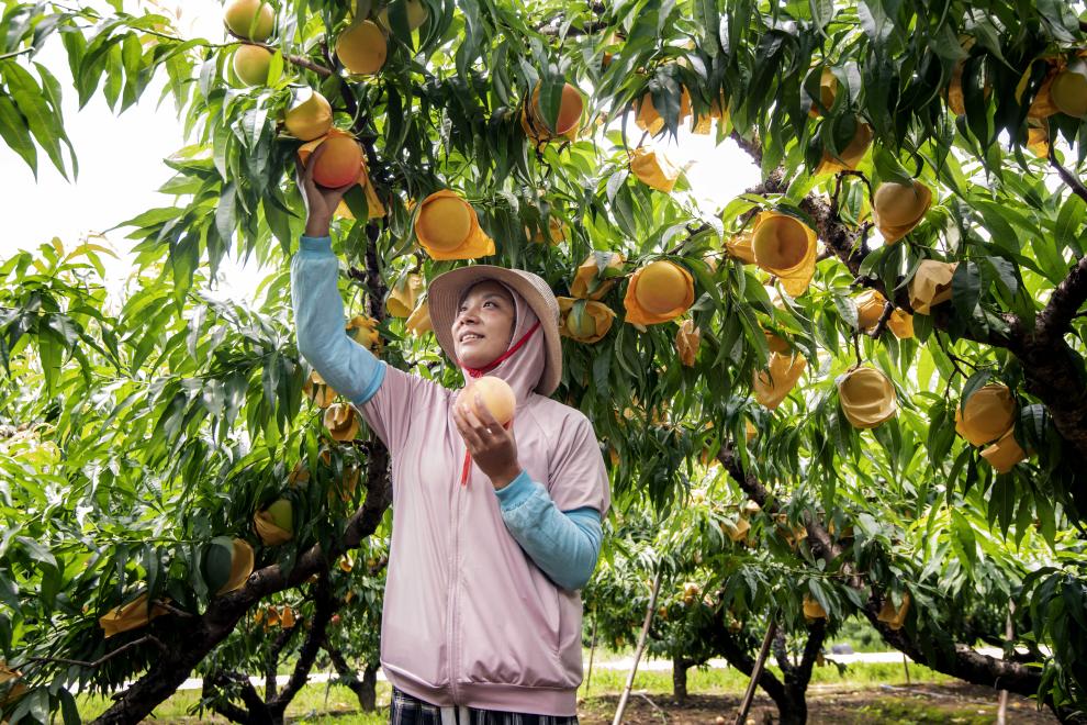 一位桃農在采摘水蜜桃。(俞顯峰 攝)