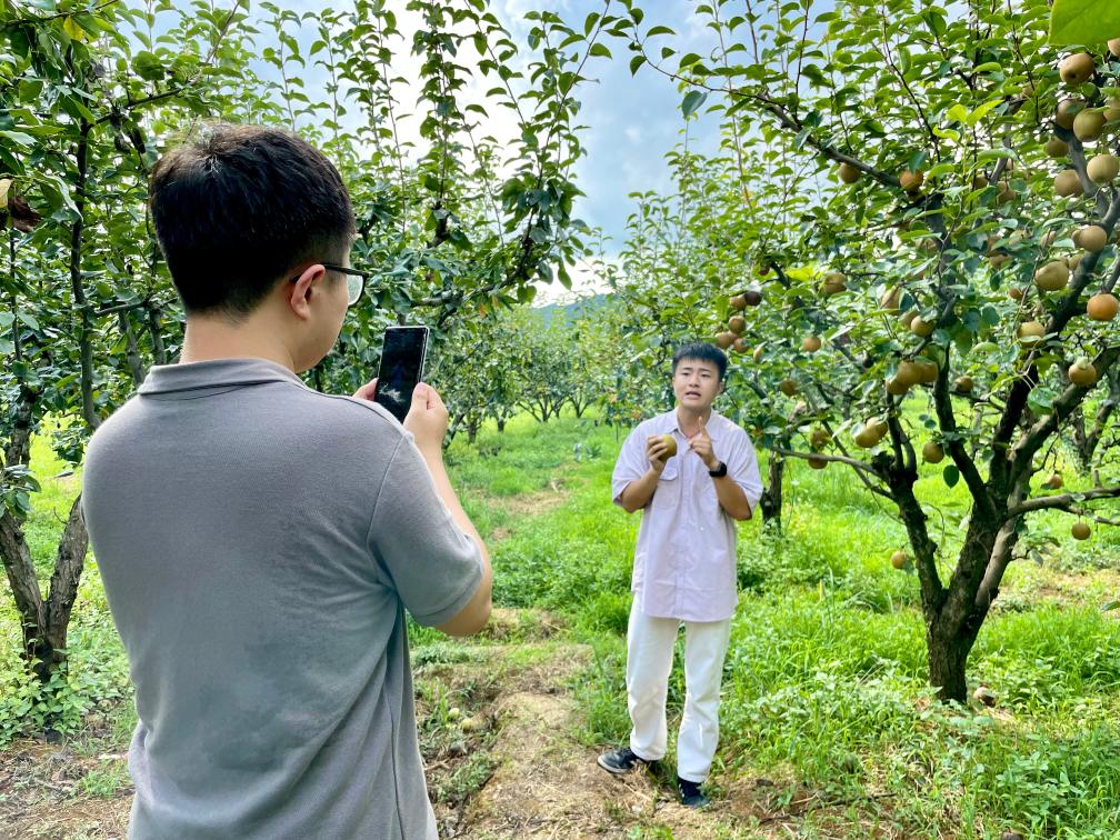順著她指的方向望去,有個年輕小伙兒正在直播:“我手上的翠冠梨,汁多飽滿‘嘎嘣脆’,今天在直播間10元兩斤包郵帶回家,喜歡的老鐵快下單!”平時果園只見果農采摘,如今還吸引大批網友在線圍觀,熱鬧非凡。