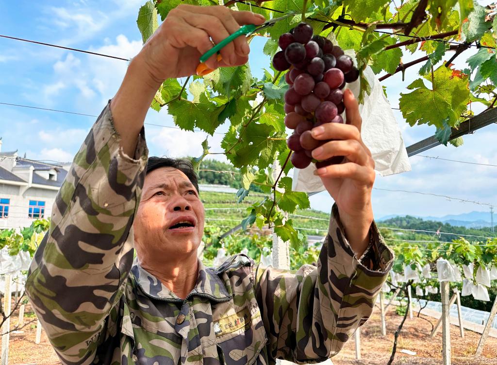 8月2日,在冷水江市鐸山鎮眉山村,謝桂民正在采摘葡萄。新華社記者謝奔 攝
