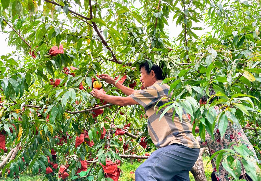 8月2日,在冷水江市三尖鎮光明村,農戶正在采摘黃桃。新華社記者謝奔 攝