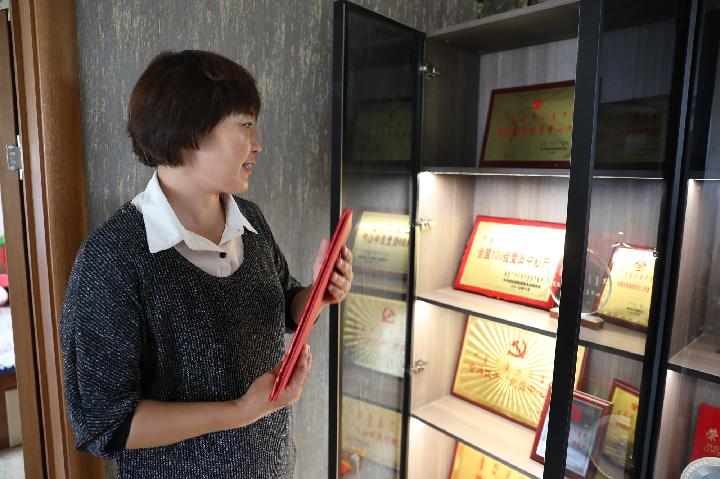 客廳一角的玻璃柜前,人們停下腳步。只見柜中整齊地擺滿金色獎狀、紅色證書和各類獎杯,上面寫著致富帶頭人、“美麗庭院”示范戶、優秀黨員中心戶和巾幗文明志愿者等。