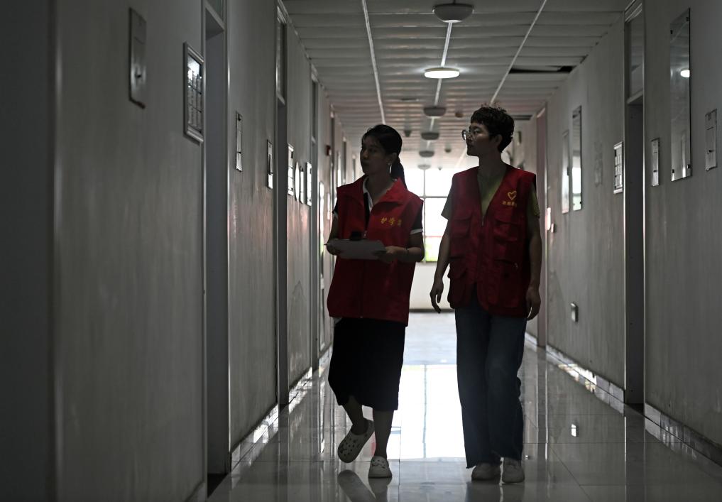 8月12日,在天津市靜海區大邱莊中學集中安置點,志愿者在樓道內巡查。新華社記者 趙子碩 攝