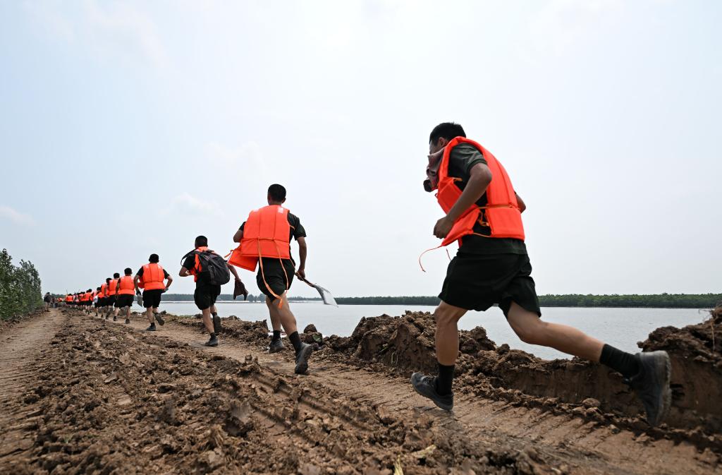 8月11日,武警第一機動總隊某支隊官兵在堤壩上奔赴搶險點。新華社記者 趙子碩 攝