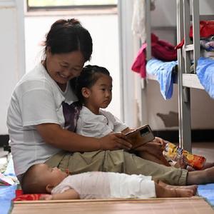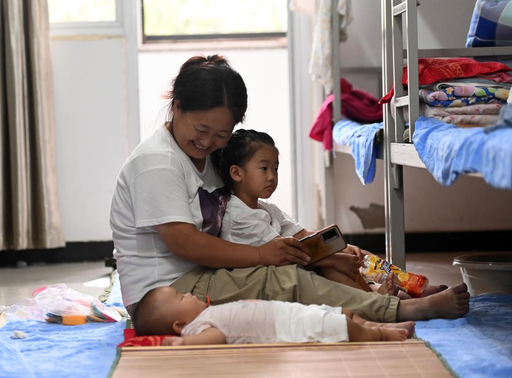 8月12日,在天津市靜海區大邱莊中學集中安置點,轉移群眾在宿舍內照看孩子。新華社記者 趙子碩 攝