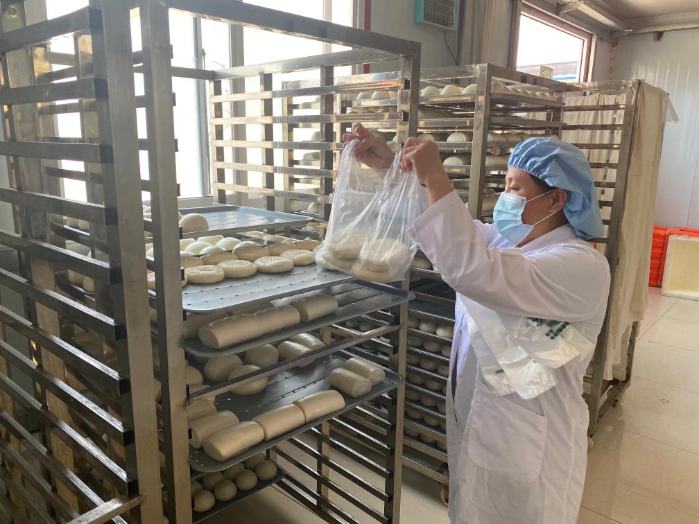 向村里走一小段,便能聞見面點的香氣,歇業了十幾天的龐嘴村饅頭坊如今水汽蒸騰。工人們正將蒸制完畢的饅頭等面點分裝打包,準備發往客戶手中。