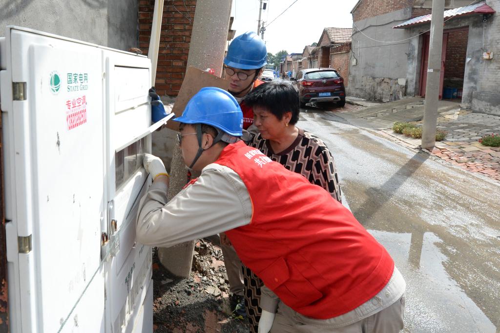 電力工作人員正在幫助龐嘴村村民檢查供電線路。(新華社發)