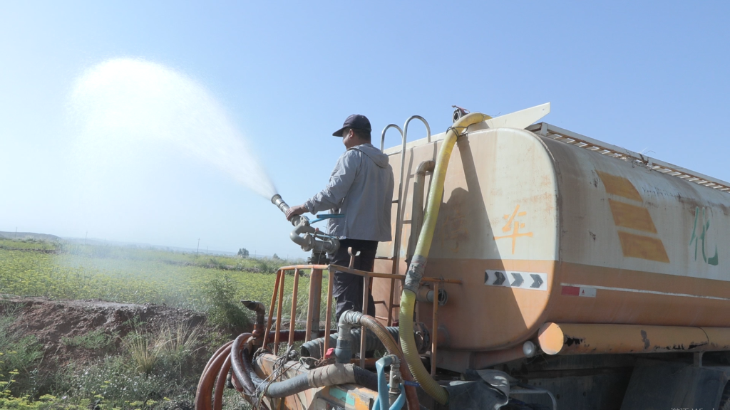 8月16日,甘肅省張掖市山丹縣位奇鎮汪莊村茴香地因干旱缺水,農戶用灑水車進行灌溉。(山丹縣委宣傳部供圖)