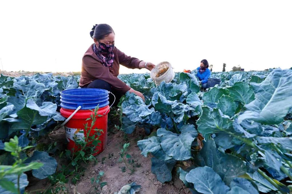 8月23日,甘肅省張掖市山丹縣陳戶鎮高原夏菜種植農戶進行手工澆水助苗成長。(山丹縣委宣傳部供圖)