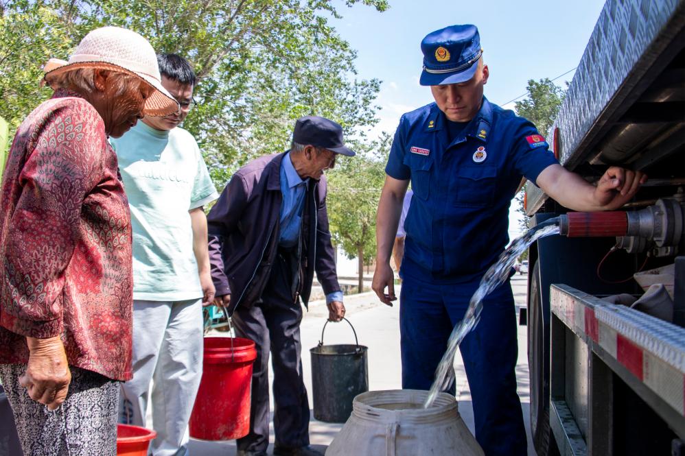 8月15日,張掖市森林消防支隊為山丹縣干旱缺水地區群眾送水。(張掖市森林消防支隊供圖)