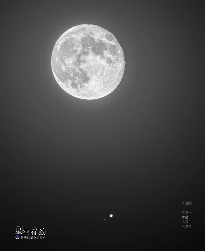 修立鵬提醒,除了用肉眼觀賞這幕“星月對話”外,有興趣的公眾如果使用長焦鏡頭或是小型天文望遠鏡觀看,不僅可以拍到月亮與木星“同框”的畫面,還可以拍到木星兩側的四顆伽利略衛星。