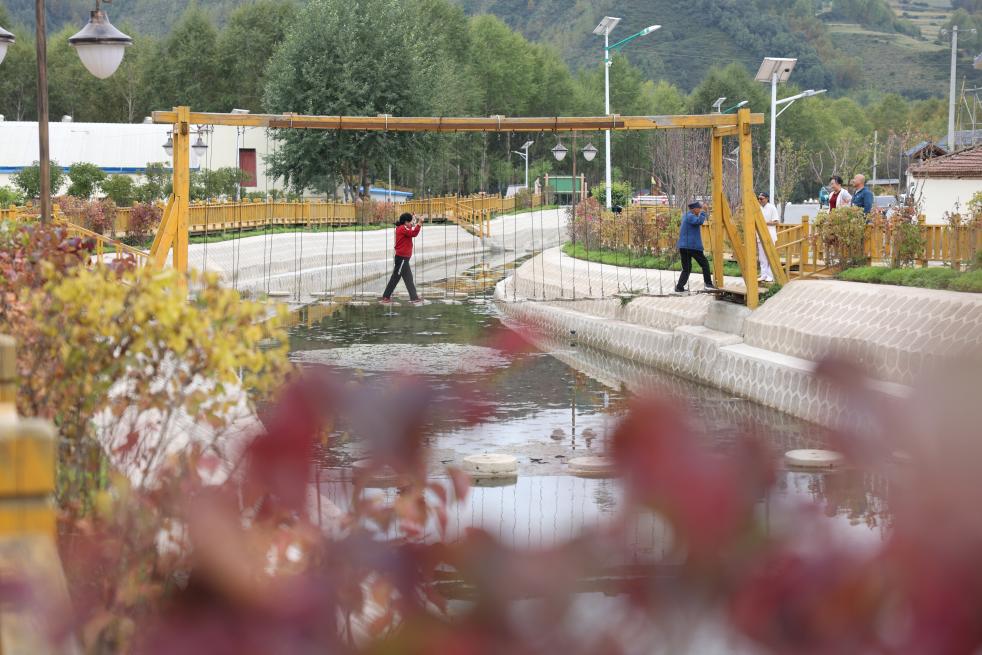 8月31日,在西寧市大通回族土族自治縣東峽鎮田家溝村,游客正在吊橋上行走。新華社記者李寧 攝