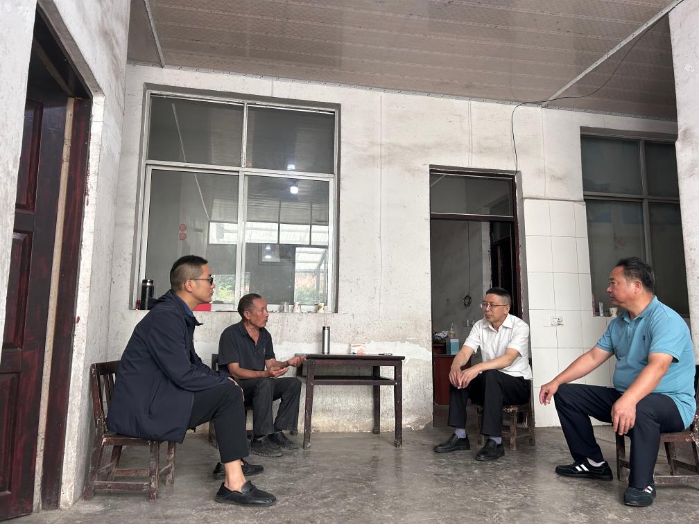 城口縣高楠鎮解事員楊常發(右二)和工作人員深入農戶調解糾紛。(羅小芳 攝)
