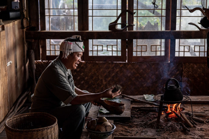 在景邁山芒景村,布朗族茶農南康在火塘邊做烤茶(9月14日攝)。新華社記者 胡超 攝