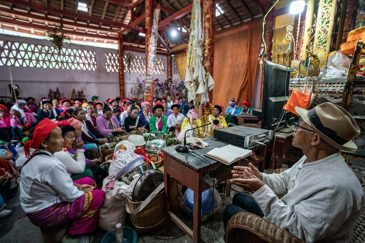 景邁山芒景村文化活動室內,年近八旬的布朗族老人蘇國文(右)在給村民介紹生態和文化保護知識(9月14日攝)。新華社記者 胡超 攝