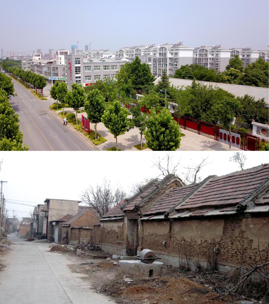 這是一張拼版照片。上圖為濟南市章丘區三澗溪村新貌(新華社記者郭緒雷 攝,無人機照片);下圖為三澗溪村舊貌(資料照片)。