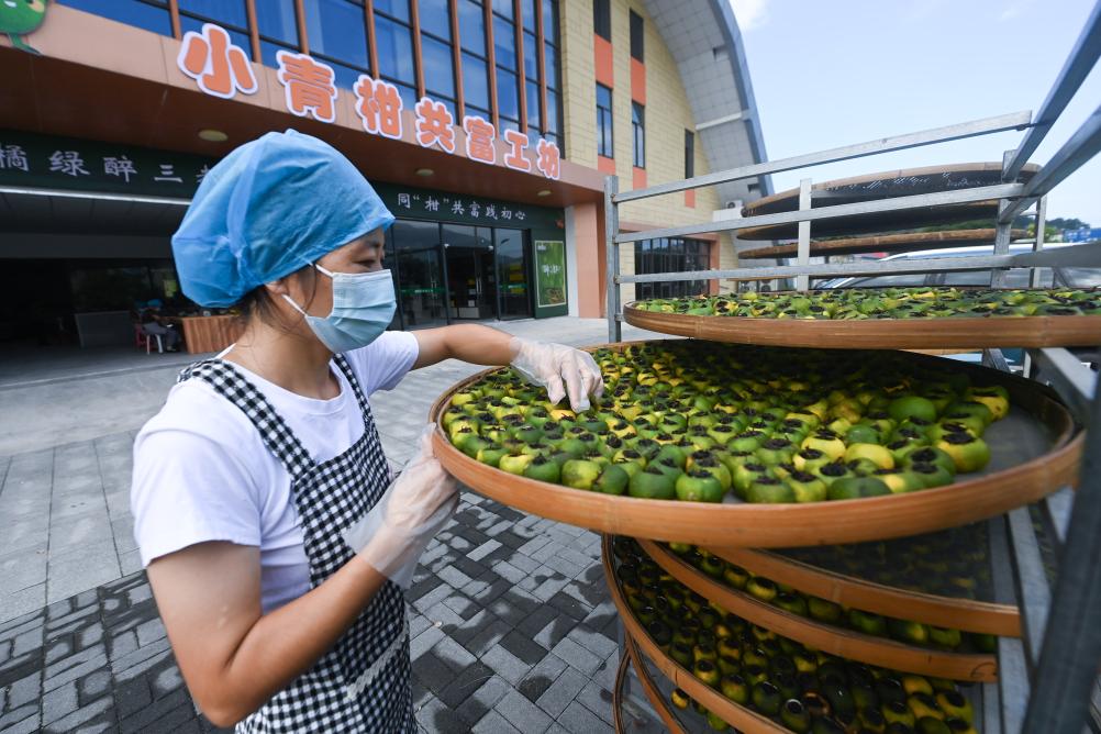在浙江省建德市三都鎮松口村的小青柑共富工坊,工人把青柑茶搬運至曬場進行晾曬。新華社記者徐昱 攝