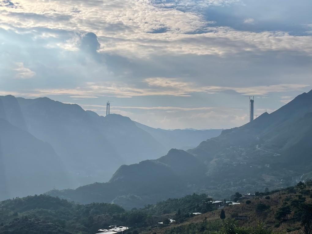 跟隨馬海扯坡的腳步,記者乘坐施工電梯一路爬升,抵達已封頂的大橋安龍岸主塔塔頂。金風送爽,但當跳出云海的日頭直射在毫無遮擋的塔頂時,身處其上的人們,臉上火辣辣的。