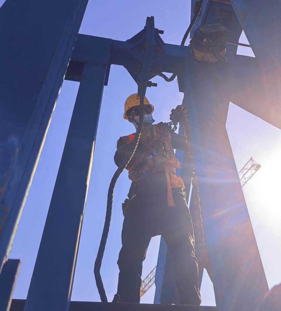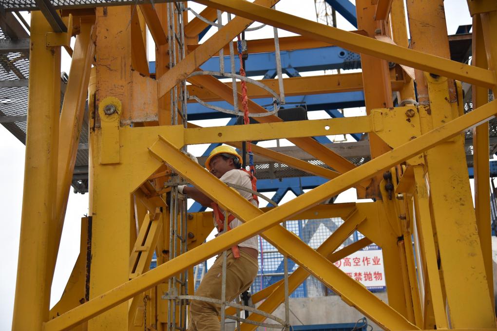 身處高空,記者內心無比緊張。而一旁的馬海扯坡和工友們則顯得比較輕松,正有條不紊地在塔頂安裝門架,為即將開展的高空大重量吊裝做準備。