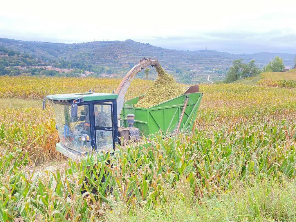 在新義村的一處農田里,玉米青儲機正在作業。(受訪者供圖)
