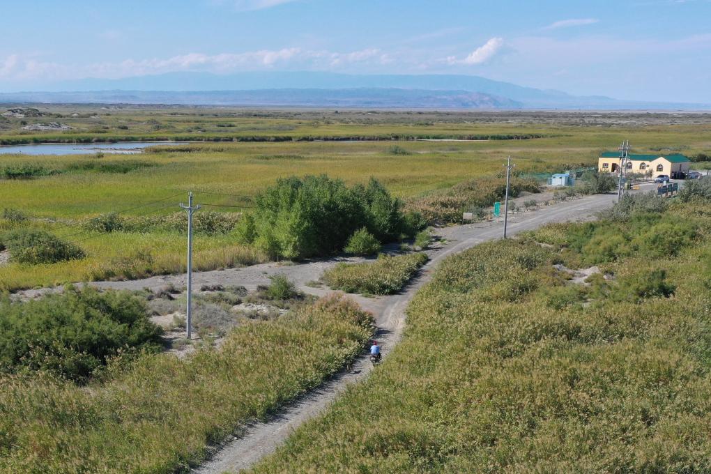 帕勒哈提·賽買提在艾比湖畔巡查。(9月6日周生斌無人機拍攝)