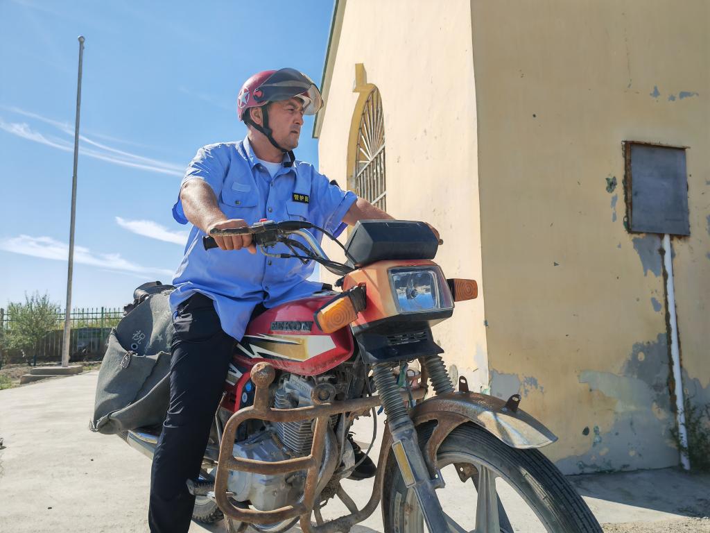 帕勒哈提·賽買提騎上摩托車,準備去巡湖。(9月6日張曉龍攝)