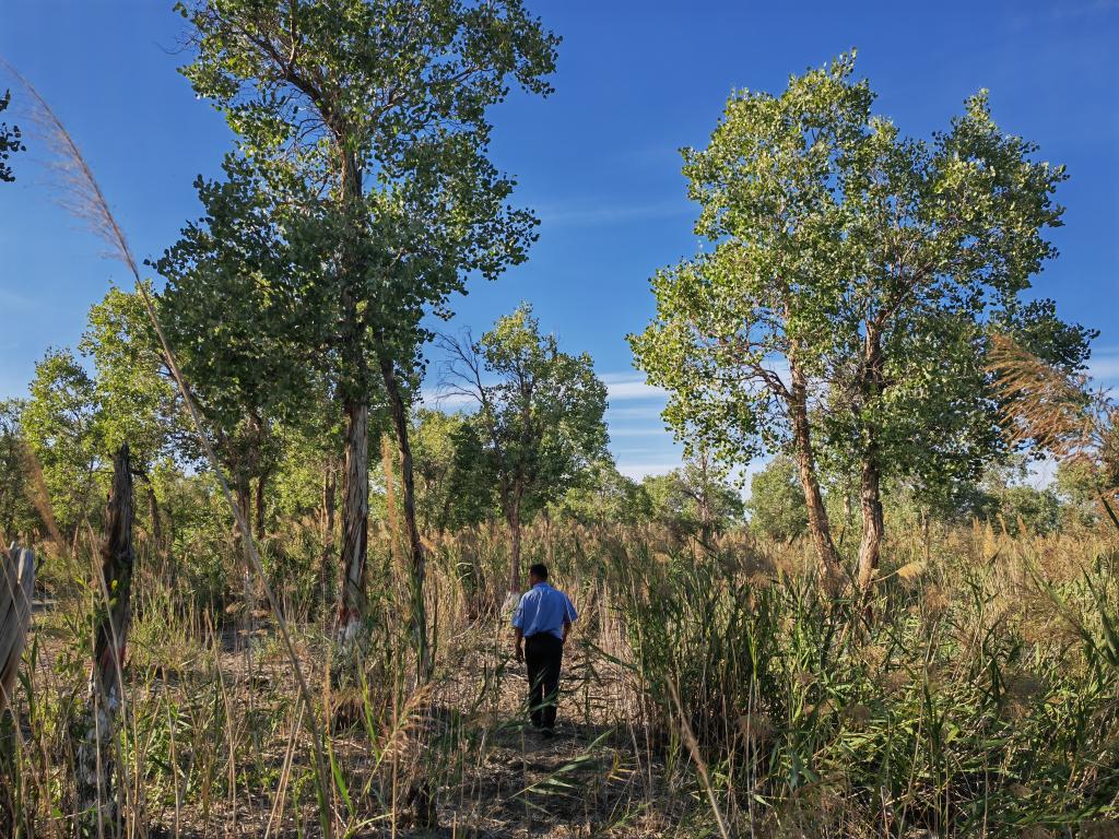 帕勒哈提·賽買提在艾比湖畔的胡楊林巡查。(9月6日張曉龍攝)
