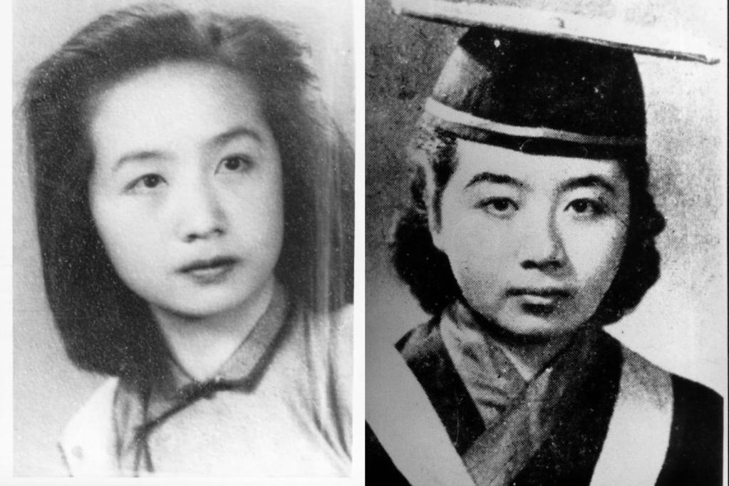 1941年高中畢業前的葉嘉瑩(左)。1945年大學畢業獲學士學位的葉嘉瑩(右)。