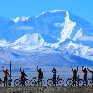 游客們騎行至卓奧友峰前合影。(資料圖片)