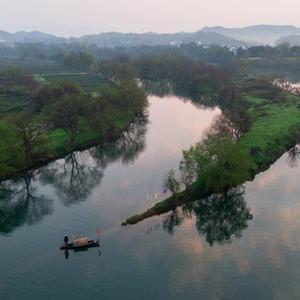 河流繞村而過,岸邊古樹參天,一彎如月小島點綴在河道之間……沿著河邊的青石板路走進石門村,白墻黛瓦的徽派民居掩映在青山綠水間。