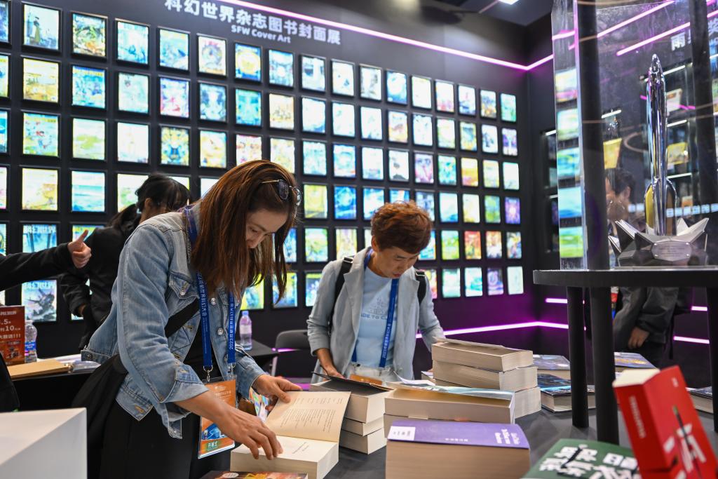 10月18日,觀眾在2023成都世界科幻大會主題展覽上挑選科幻書籍。新華社記者 胥冰潔 攝