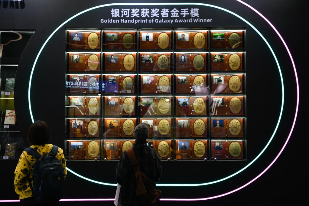 10月18日,觀眾在2023成都世界科幻大會主題展覽上觀看歷屆銀河獎獲獎者金手模。新華社記者 胥冰潔 攝
