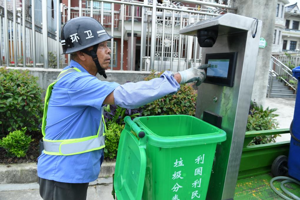 浙江省德清縣乾元鎮易腐垃圾清運員使用垃圾分類智能機器。新華社記者林善傳 攝