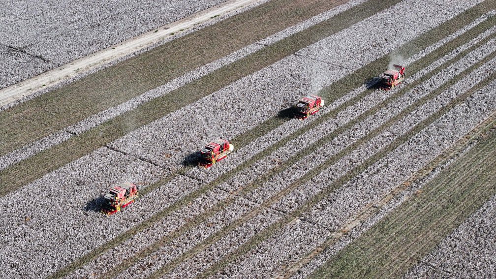 通過持續推進高標準農田建設,強化農業科技和裝備支撐,新疆不斷夯實“藏糧于地、藏糧于技”的物質基礎,如今,新疆棉花種植面積連續多年位居全國第一,玉米單產紀錄屢屢刷新,位居全國各大產區前列。截至10月22日,新疆已收秋糧1940.7萬畝,收獲進度已近八成。