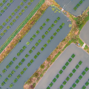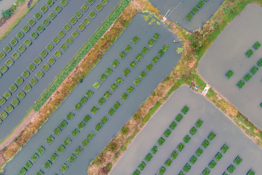 這是10月27日拍攝的湖北省仙桃市張溝鎮先鋒村的黃鱔養殖網箱(無人機照片)。(杜子璇 攝)