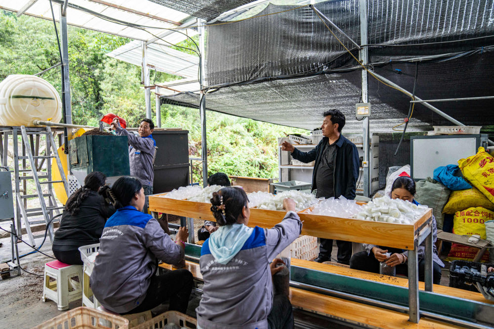 在墨脫縣格當鄉尼日卡林下資源種植合作社,貢秋次仁(右二)指揮工人生產菌包(2023年10月12日攝)。新華社記者 孫非 攝