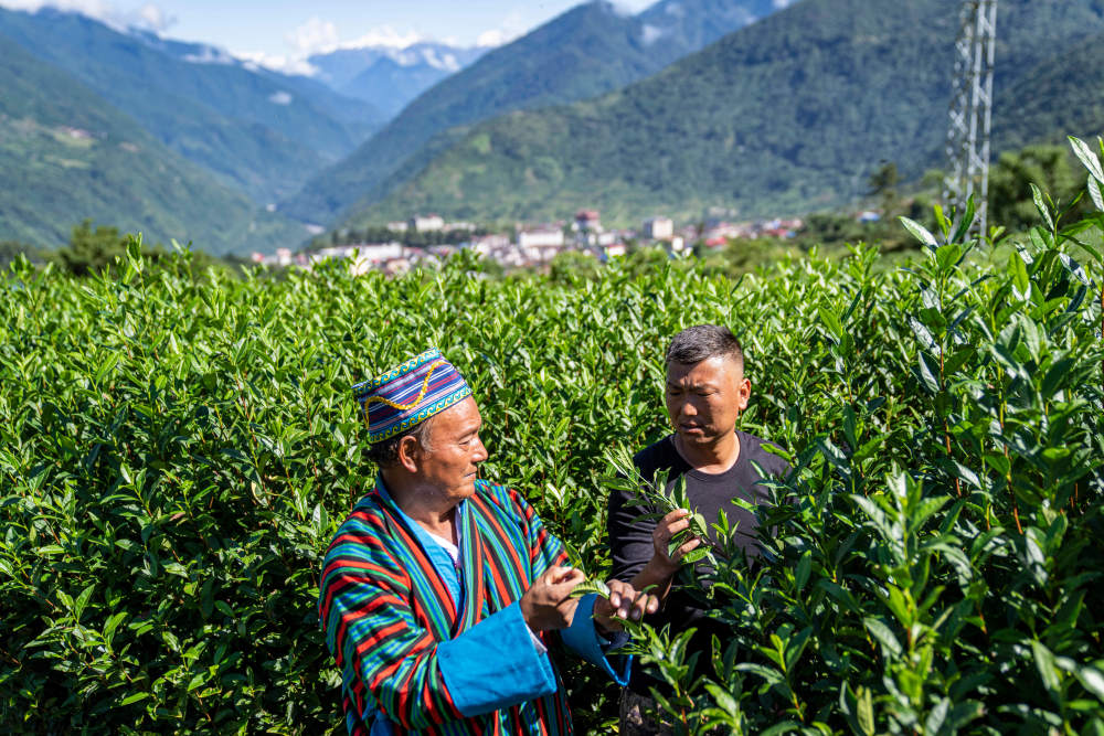 墨脫村村委會副主任達瓦次仁(右)查看茶葉生長情況(2023年10月13日攝)。新華社記者 孫非 攝