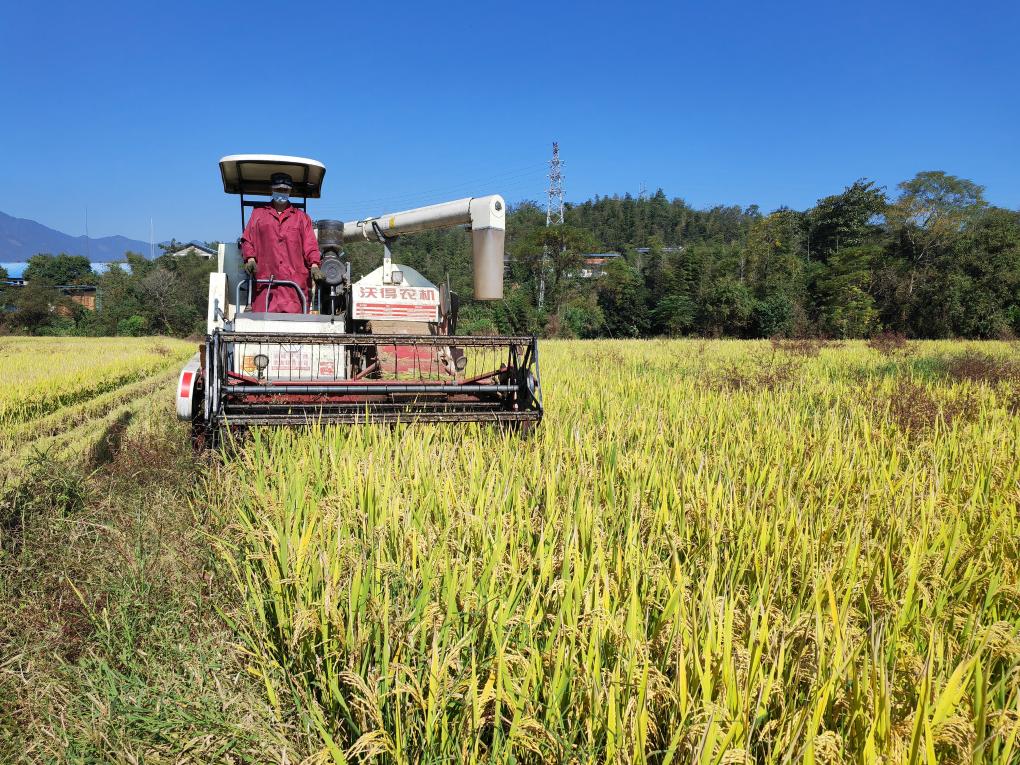 一臺臺收割機在稻田里來回穿梭,切割、脫粒、碎稈,伴隨著陣陣機器轟鳴聲,一株株沉甸甸的稻穗變成金黃飽滿的稻?!锸諘r節,走進福建省南平市浦城縣田間地頭,空氣中彌漫著陣陣稻香。
