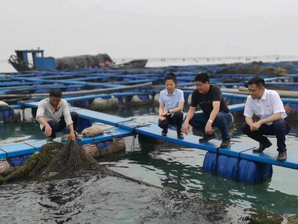 銀行工作人員在漁排上了解企業養殖情況。新華社記者秦宏 攝