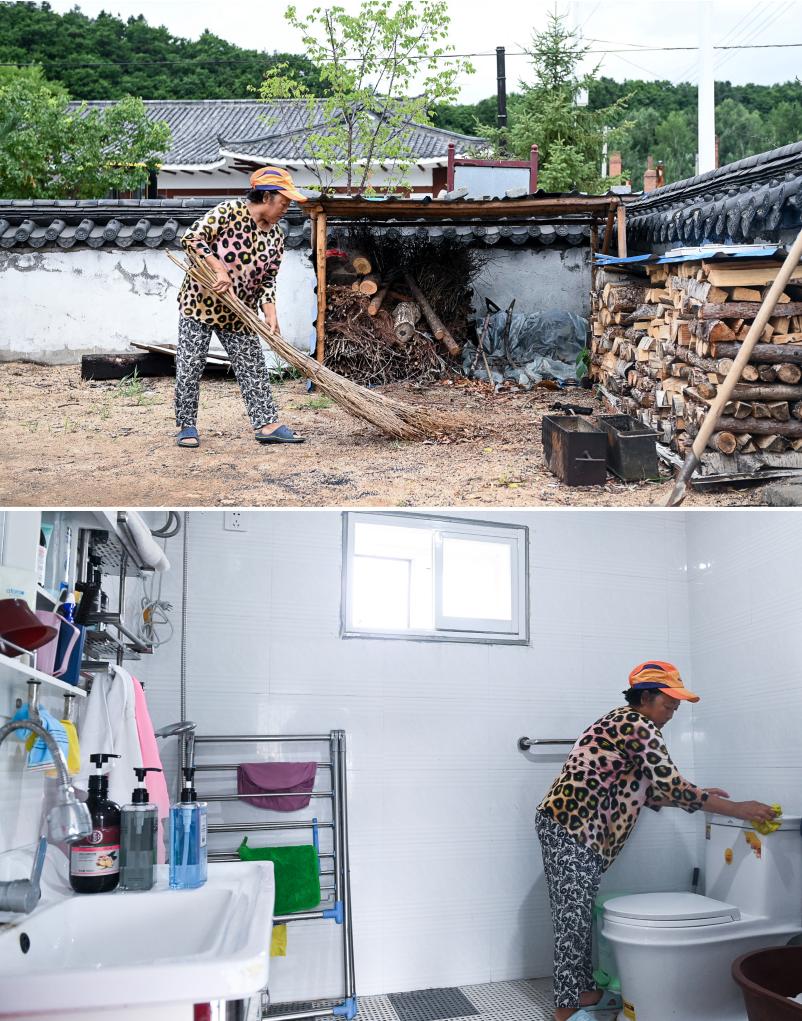 上圖為吉林省延邊朝鮮族自治州圖們市石峴鎮水南村村民康順姬在打掃院子里的旱廁舊址;下圖為康順姬在打掃室內廁所。新華社記者 顏麟蘊 攝