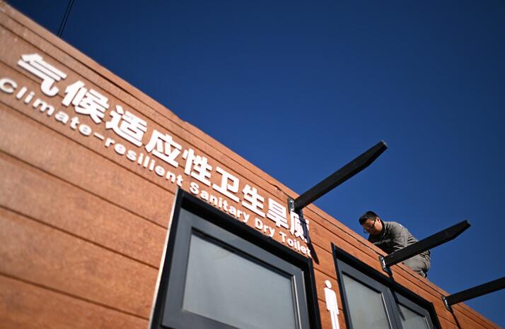 2023年11月1日,在青海省海東市平安區三合鎮幸福家園社區,一名施工人員在社區內安裝環保廁所。新華社記者 張宏祥 攝
