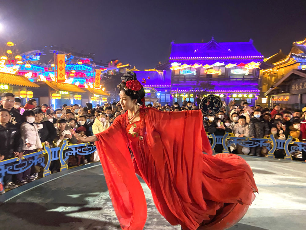 大宋不夜城的主街道“華燈錦里”,總長500米,寬11米,沿街兩側的府邸建筑、商鋪和夜市攤位燈火輝煌,展現出繁華熱鬧的場景。在這條長街上有十八幕傳統藝術演繹,每天晚上,演員們身著宋制漢服,有的和著歌樂敲起宋代街鼓;有的彩袖翩躚,跳起一支優雅的宮廷舞;有的化身“圣手書生”,伴著音樂筆走龍蛇……“這些表演都是以宋代傳統文化為底色,再進行現代改編,讓游客更能夠接受、欣賞?!眲㈥栒f。