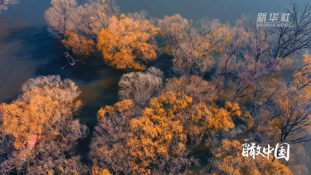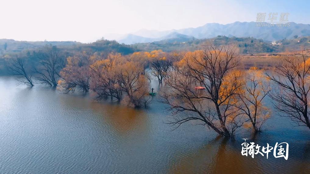 初冬時節,河北省石家莊市贊皇縣的平泉湖靜靜地安臥于群山環抱之中,舉目望去遠山如黛,澄澈碧藍的湖水煙波浩渺,山水相映??每昧鴺滏鼓榷嘧?,映著清澈的湖水,似美人照鏡,明艷動人,美不勝收。